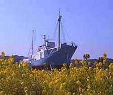 左の画像は獅子岩、右の画像は太地に展示されている実物の捕鯨船が菜の花に浮いたように見える。