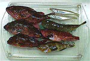 曇り時々晴れ、波高50cm、風がほとんど無く非常に釣りやすいが日中は暑かった。 |