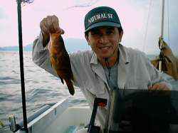 取りあえずスーパーで買ってきた子アジをつけてポチャン。水深30mでグッグー、うれしいアコウがあがってきた。先週の27cmより大きい30.5cmに気をよくしてはいポーズ。