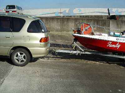 スロープに着いて トレーラーの延長 部分をチェック。ボルトの緩みや角パイプのねじれ、溶接部のひび割れ等目視とスパナで行ったが異常なし。