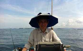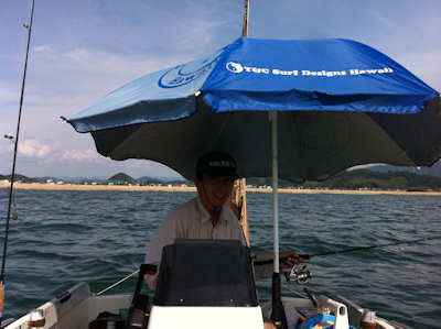 ある程度の風であればパラソルの使用はOK。 ボートを走らせる時はたためばよいので意外と手軽。 取り付け位置の関係と、日差しの方向からこの時点では私は完全に日陰、女房は半分だけ日陰。 12時を過ぎると結構風が強くなり使用を止めた。 |