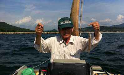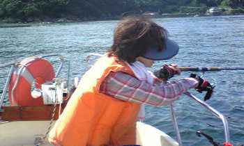 キス釣りのポイントに行くと漁船がわんさかいる。 しかも2隻がペアで網を引き縦横無尽に走り回っているので釣りをすることが出来ない。 後で聞いてみると、和歌浦は「しらす漁」で有名なポイントなので漁船が集結するらしい。 このポイントを避け、マリーナシティーの南側や、雑賀崎の所まで移動したがどこもしらす漁の漁船が走り回っている。 あっちでちょこっと、こっちでちょこっと、ウロウロしたが全くだめ。 結局11時ごろしらす漁の漁船がいなくなったのでいつものポイントに入った。 網を引きずりまわしていたので望みが薄いが、水深6メートルぐらいの所はあまり走ってなさそうと勝手に判断し釣り開始。 |