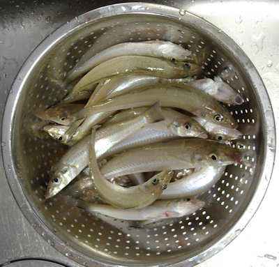 船上で内臓等を全て処理して持ち帰ったので、画像の魚はおなかがぺちゃんこだが卵をたっぷり持ったものもいた。 大きいやつ2匹を除いたボールの中の魚もまあまあの天ぷらサイズ。 チャリコも塩焼きにちょうどいいサイズでだが1匹のみ。 |