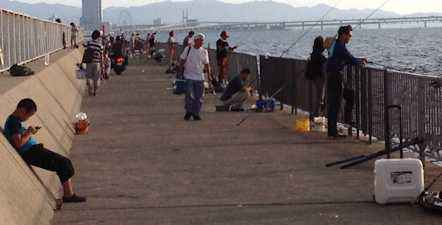 のんびり下道を走り、レンガ大の撒きエサのアミえびを買って釣り場に着いたのが午後4時ごろ。平日なのに入る隙間が無いほどの釣り人の数にビックリ。一番奥の突き当りを曲がったあたりに少しスペースがあった。